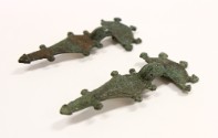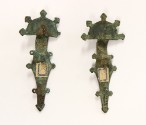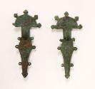 DescriptionBronze fibula with incised geometric design of spirals and lines. At the top, half a circle with five protruding pierced knobs shaped like arrowheads. Curved bridge. Long pointed bottom section with six knobs. Curved clasp; pierced socket for pin shaft. Blue - green patina.On View