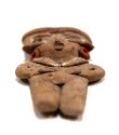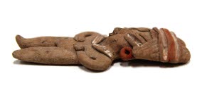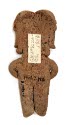 DescriptionStanding figure, with noticeable bits of color, such as red ear plugs, a red and white striped headband, and a white necklace. The arms are folded at the chest. The figure has no breasts, but a pregnant belly. (See: 1964.2.41)