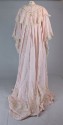 DescriptionPink pongis silk. Ecru lace and hemstitching. Stand up collar of lace lined in ribbon. Round yoke of strips of pink and silk and ecru cross-hemstitching set off with deep ruffle of lace, insertion, tucks, hemstitching, in serpentine designs. Cape effect over sleeves. Trained.On View