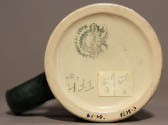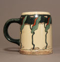 DescriptionA ceramic handled mug, painted with a repeating pattern of abstract plants, possibly water lilies. There is a maker's mark on the bottom depicting a winged head above the name "Villeroy and Boch - Mettiach" (final word is not completely clear). Next to the top of the handle is stamped "4/10 L" and in the base is stamped "III" and "03."On View