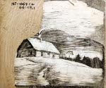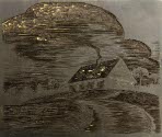 DescriptionArtist's home overlooking Goddard campus, house on hill, smoke coming from chimney. Image is carved into a wooden block, and covered all over in black ink. There are some spots in the clouds that are not inked.On View
