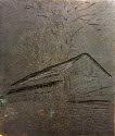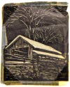 DescriptionCovered bridge with trees behind in winter snow on roof. Image is carved into a wooden block, and covered all over in black ink.