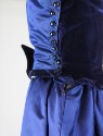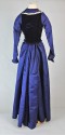 DescriptionTwo piece blue satin dress, fitted, boned bodice, inserted blue velvet front and back panel on waist line, edge with velvet, fastens on the side under the sleeve with nine buttons. Detached high collar. The skirt is pleated in the back, edged with velvet, lined eith dark grey cambric at the botton with train.On View