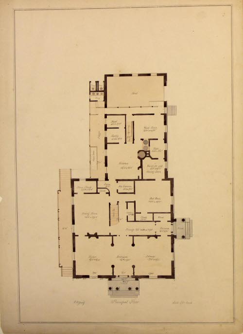 DescriptionPrincipal floor plan of Wheeler House drawings in watercolor (browns and greys); inked measurements and labels; inked borderOn View