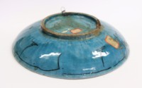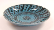 DescriptionShallow bowl, black painted design consisting of center medallian of a petalled flower, surrounded by circle and flutings, cross hatching, and small abstract flowers. On the outside wavy black lines are placed widely around the bowl. Three incomplete knobs on the inner surface. Made of white clay. Small foot.