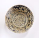 DescriptionWhite undercoating (glaze or slip) painted with blue and black design of spirals and flowers? and short curing lines in one large band and central medalion seperated by a white band on the inside. Similar design on outside with two white bands defined by blue lines near the base. The bowl is fairly deep with flairing sides and very shallow small hollow foot.On View