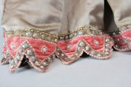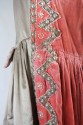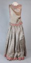 DescriptionEvening dress, velvet salmon colored panel on beige. Satin silk, strips of bead embroidery, full skirt, low waist line. Inner salmon velvet bodice.On View