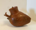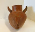 DescriptionChimu jar in the shape of a deer's head. Typically monochrome, although orange, with incised lines forming eyes and mouth. The spout is between the horns with small ears modelled under the horns.On View