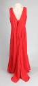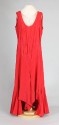 DescriptionRed rayon moire evening dress. Sleeveless, with a U-neckline in front and a deep V in back. There is a bow at the center back neck. This V formation is echoed in the piecing of the back and front of the dress, much of which is done on the bias. The skirt features the popular uneven hemline of its time, trailing in the back and as a high as mid calf in front. The neck and arm hole edges are finished with self-fabric bias binding.