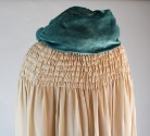 DescriptionEvening wrap, cape is off white silk, shirred on top, heavy silk fringe on bottom, silk embroidery, turquoise velvet collar, lined with off white wool.