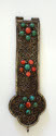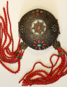DescriptionMongolian bride's headdress of silver encrusted with turquoise and coral. Silver braid appliqued in all over design of Chinese knots and scrolls. Top has placque in opening set with oval coral. Two side flaps on hinges. Two smaller plaques on rings with three strands of red beads. Hinged long piece over forehead.On View