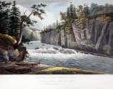 DescriptionView of rapids flowing from around large cliff on the right and passing in front to the right; thick forest on left; man in orange fishing left center foreground; scraggly tree growing out from rocks on leftOn View