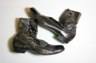 DescriptionOne pair of brown high button shoes. Hard black leather toe. Firm brown leather near sole. Brown kid for upper portion. Nine button holes. Stacked leather heel, 1/2 " high.On View