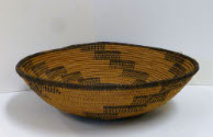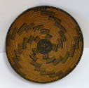 DescriptionBundle-coil construction with knotted-coil start and self-coiled rim finish. Design in dark brown devil's claw (martynia) of spiraling steps with vertical stripes beneath solid horizontal line.On View