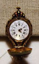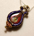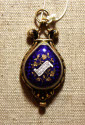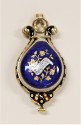DescriptionWatch with no maker's name. Hallmarks and case, blue and red, lyre shaped. Four strings, small glass gem at each end of each string. Back of lyre(front of watch) has sheet of music and gold shamrocks. Ring at top. Stem winder. Opens to show face with Roman numerals for hours, Arabic minute figures by 5's.On View