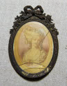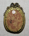 DescriptionOn a piece of fabric (silk?), a portrait of a woman with an elaborate hairdo topped with a wreath of roses.