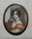 DescriptionMiniature portrait of a young woman with dark hair and blue eyes. She is wearing a white dress with a red shawl.  In her hair she has a green and yellow ribbon.On View