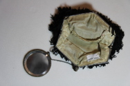 DescriptionBlack evening fringed bag. Silver chain, handle - clasp. Brilliants. Mirror on chain in pocket.On View