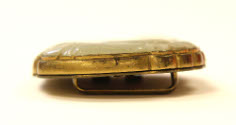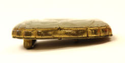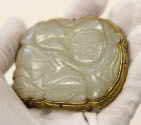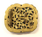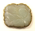 DescriptionMilky jade incised with face. Irregular shape set into open-worked bronze base of floral design. Loops and hooks on back.On View
