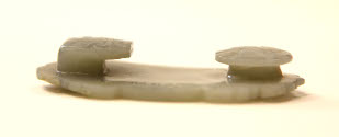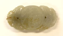 DescriptionCarved milky jade with yellow imprefections. Character in circle flanked by butterflies. Knob on incised back.On View