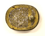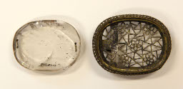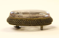 DescriptionSmooth oval rock cystal set into bronze frame of openwork. Knob on back. Two feet, knotted mesh edge on metal base.On View