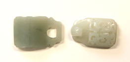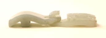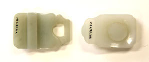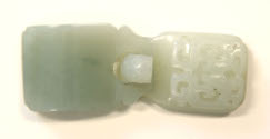DescriptionGrey green jade, two piece buckle, hook is white, elaborately carved rounded square, eye is grey/green, plain rounded square. Differently shaped ends. Questionable whether pieces belong together. a- Pale Green b- Milky