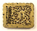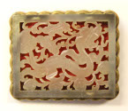 Descriptionrectangular bronze and milky jade openwork plaque with red felt (?) backing