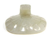 DescriptionPale green jade belt hook with radiation flower petals. Cross-hatched and dragon head hook. Lotus flower design.On View