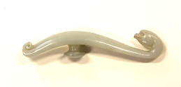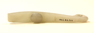 DescriptionMilky jade with hawk-like head. Knob on back. Small decorative carving on base.On View