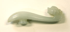 DescriptionMilky jade dragon headed belt hook, rounded bottom, brown mark lower left side.