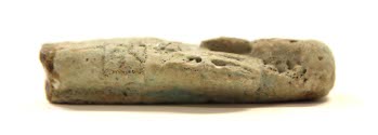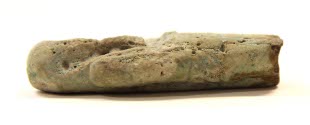DescriptionTop portion of figure with beard and wig, crossed arms; plinth back; incised hieroglyphs on front; blue-green glazeOn View