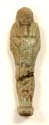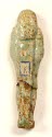 DescriptionModeled features; blue-green glaze with reddish-brown spots; bearded, standing on platform with plinth; incised vertical row of hieroglyphs down the frontOn View