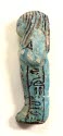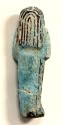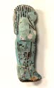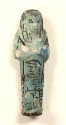 DescriptionDull blue-green glaze on faience; painted (in black) features and three columns of hieroglyphs vertically on sides and front; wig indicated with stripes; painted tools.On View