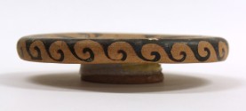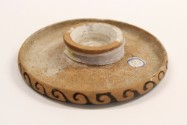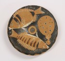 DescriptionBlack plate with two red fishes and a jelly fish with white accent lines, slightly convex surface with indented circle in center. Round rim turned down painted with wave design in black on red. Flared small base.On View