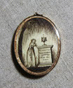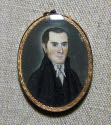 DescriptionOval miniature in gilt frame, covered with glass. Red with white ribbon, round attachment at top for chain. Greenish dark background with lighter halo around figure. 3/4 view bust of a man. Black coat with high collar, black vest, white tie in a bow. Brown hair, thin mouth, long straight nose, dark straight eyebrows. Reverse: Brown on ivory. Woman leaning on a tombstone with an urn on top, under a willow. Tomb inscribed: "In memory of Calvin Whiting from his friend Spencer Whiting"On View
