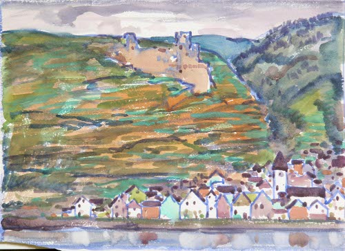 DescriptionVillage with castle on the hill behind.On View