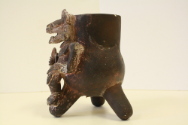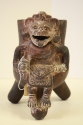 DescriptionThe pottery is predominantly dark brown, some orange spots, white slip on figure. Figure has jaguar head, open mouth, protruding tongure, small headdress, two earplugs. The human body has a rectangular bib covering the shoulders; two arms, right hand clutching cylinder shaped object. An inscribed triangular bib is overlaid on a rectangular insribed bib and extends from the waist to the knees and encircles each ankle.On View