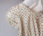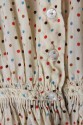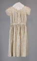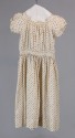 DescriptionBeige cotton with blue, red, and brown dots; slightly scooped neck and short puffed sleeves; embroidered on neck, sleeve and waist bands; buttoned to waist opening; beautifully made by hand.On View