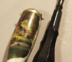 DescriptionLong pipe with flexible tube to the mouthpiece. Porcelain bowl with woodland scene. Can be unscrewed into five pieces.