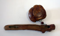 DescriptionPipe case made by hollowing out a stick or root, open at one end and slit down side. Left in rough condition. Pipe, wooden stem with tiny brass bowl and mouthpiece. Tobacco case made by hollowing out a burl and fitting in a wooden plug. Cases held together by green cord and wooden bead.On View