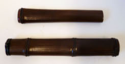 DescriptionPipe and pipe case, Japanese. Pipe, reed, stem with pewter bowl and mouth piece, decorated with black and gold paint. Case carved from dark wood to represent sctions of bamboo. Made in two pieces which fit together as fountain pen and top. Bone stick, pointed at one end and spatulated at the other in case with pipe, possibly for cleaning, tamping, etc.On View