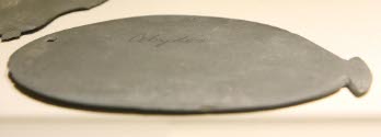 DescriptionThin piece of stone shaped into a fish with tail. Hole drilled for eye, and in center near the top. Possibly from Abydos.On View
