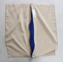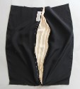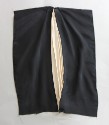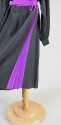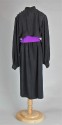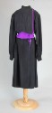 DescriptionA: Black long - sleeved silk crepe de chine dress with three violet pleated bands; one on each arm and one vertically the length of the dress from left side of neck. (6 buttons at left shoulder; 2 at each sleeve cuff) B: Violet belt C: Black swatch with white pleated band D: Tan swatch with blue pleated band.On View