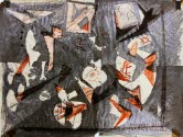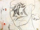 DescriptionSide one: large head of a man, neck slants toward lower right corner. Left ear of man shown. Done in bold pencil strokes, geometric shading on face. To right of large head is a female profile facing downwards. Lower left of large head is a similar profilefacing left but scribbled out. On the left edge upper and lower are two abstract shapes. The upper done in pencil with an orange ball attached, the lower done in orange. The entire paper is divided by three vertical lines placed 8.2 cm, 25.3 and 42.4 cm from the left edge. It is divided by three horizontal lines placed 21.4 cm, 23.9 cm and 26.3 cm from the top; these lines form six big boxes and two smaller ones; written in the top three boxes: Box 1; L box 2; D and box three; I; on the bottom row from left to right are box 1, L box 2; D and box three; I; SIDE 2: divided into 8 dark triangular shape which join in the center and fan out to the edges of the paper; the dominant color is black with orange and white used to a lesser degree; abstract shape situated over triangles background; thre sun-like form semi-circle from center towards top right; center sun is orange middle, next is a smaller orange sun, and at top is a black one; white forms come from paper not applied color; more of the forms are orange and bulbous; the lower left side has an orange form similar to a hand, within a white space; the hand form has a black mark over it; four of the triangles are roughed in ith crayon while 4 seem to be painted with watercolor; the piece is signed by Margules, Gorky and Noguchi and dated '39 in the lower right corner in orange crayon.On View