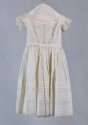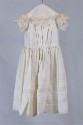 DescriptionWhite linen girl's dress, sleeveless, rounded neck, four buttons in back. Hand-punched flower designs at sleeve holes and neck. Small embroidery at hem. Two sts of 5 and one set of 6. 1/2 cm "lets" at bottom of dress, gathered waist.