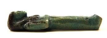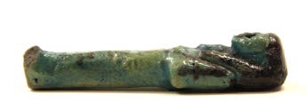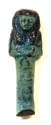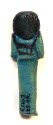 DescriptionBlue glazed faience mummiform ushabti holding hoes with basket straped to back; tools, wig painted on in black; column of hieroglyphics down front of figure.On View