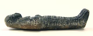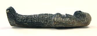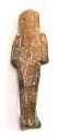 Description19th century copy of ushabti in terra cotta colored pottery originally painted with reddish brown, green; now mostly black; 7 bands of hieroglyphs incised on frontOn View