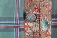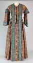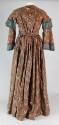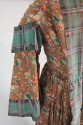 DescriptionBrown floral printed silk with green plaid taffeta robings or trim in 2 strips on either side of front buttoned opening, on shoulders and edge of sleevs. Slightly lowered "jewel" neck in front, 3/4 flared sleeves, fitted waist with gathered skirt.On View