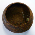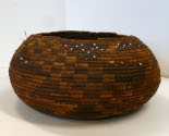 DescriptionThree-rod coiled construction with design in dark brown on a lighter brown of diagonal checkered bands and triangles. White glass trade beads are sewn on the triangles. Knotted coiled start. (Same design as 1971.10.13) Once feathered.On View