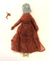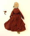 DescriptionDoll body made of corn-cob to waist, covered with white cotton. Arms and legs wood, probably belonging to another doll earlier. Left shoe painted yellow, right foot whittled later. White cotton trousers edged with crochet; white petticoat with deep, finely stitched hem. Dress of reddish-brown cotton with a pattern of white wavy lines; skirt in two layers. Hair blue yarn; facial features marked in pencil.On View